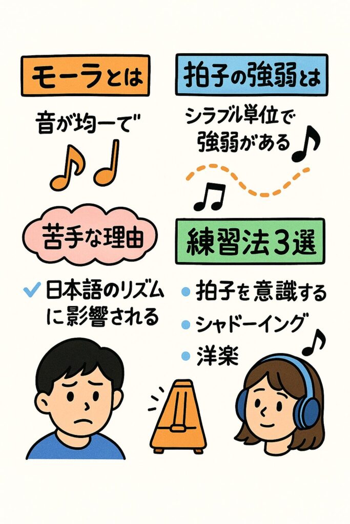 - 日本語は「モーラ(拍)」中心で音が均一なため、単調に聞こえやすい。